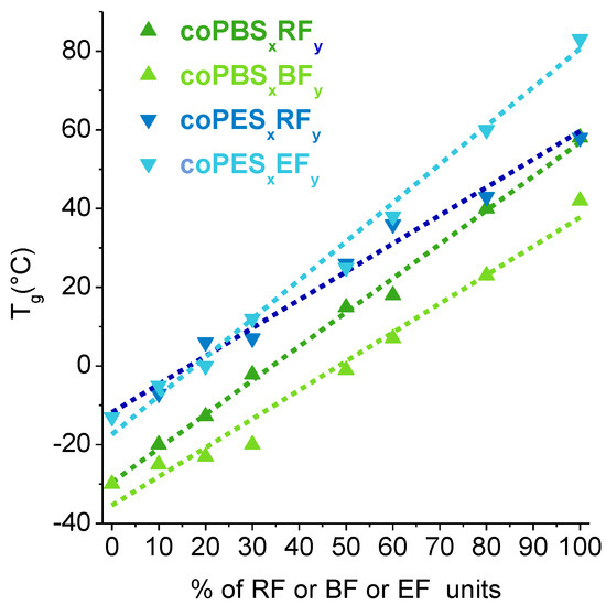 The conclusions that may be drawn from these data, are the following: (a) In both series, Tg varies with composition monotonically between the values of the two respective parent homopolyesters largely according to what is predicted by both the Fox [33] and the Gordon-Taylor [34] equations with a better fitting for the latter case (see Figure S4 in the SI file). The slight deviations observed between predicted and experimental values could be explained, at least in part, by differences in molecular weight. These results are in full agreement with the random microstructure determined for these copolyesters by NMR and are consistent with the absence of crystallinity that in general is observed in their DSC traces. (b) Incorporation of the RF units entails an increasing of the Tg with a slope noticeably higher for the coPBSxRFy series in consistence with the lower Tg of PBS compared to PES. (c) Differences in Tg between the two series diminish as the content in RF increases to finally converge in 58 °C which is the Tg of the PRF homopolyester.