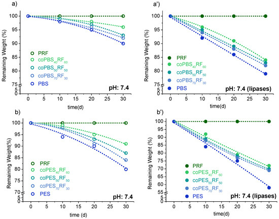 Weight loss of resorcinol-containing succinate-furanoatecopolyesters as a function of incubation time in aqueous buffer at pH 4 and 37 °C (a,b) and under the same conditions but with lipases added to the incubation medium (a’,b’).