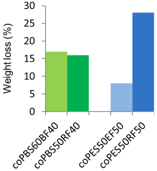 A reference of the biodegradation results obtained here for coPBSxRFy and coPESxRFy to those reported for the coPBSxBFy and coPESxBFy series seems opportune. Comparison had to be however restricted to those particular compositions for which biodegradation data are provided by the different works, which actually are limited to the coPBS40RF60/coPBS40BF60 and coPES50RF50/coPES50EF50 pairs. Biodegradability of these four copolyesters taken as the sample weight loss observed upon incubation with enzymes is compared in the graphic bar depicted in Figure 12. In this plot it is clearly shown that the sensitivity of copolyesters made from BD to enzymatic degradation is scarcely dependent on the substitution of this alkanediol by HER. On the contrary, comparison of PES50RF50 with PES50EF50 reveal that the weight lost in the former was about five times than in the latter, which is indicative that coPESxRFy copolyesters are much more sensitive to biodegradation than their coPESxEFy analogs containing similar amounts of furanoate units. The rather striking different behavior displayed by butylene and ethylene based copolyesters could be explained taken into account the relative differences in both Tg and crystallinity between the two series of copolyesters under comparison.
