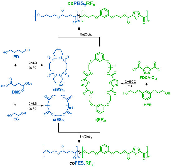 The synthetic route followed in this work for the preparation of coPBSxRFy and coPESxRFy copolyesters by ROP including the synthesis of the cyclic oligomers and their polymerization is depicted in Scheme 1.