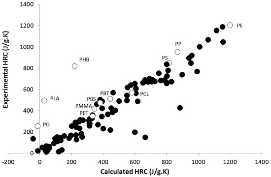 Experimental versus calculated heat release capacity (HRC) for more than 100 polymers (data drawn from [4]). White circles correspond to the 11 polymers studied in this work.