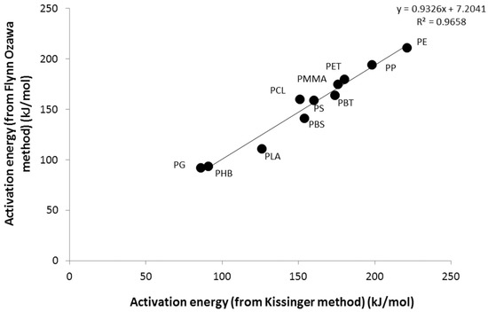 Table 2 presents the activation energies calculated from the Flynn-Wall-Ozawa and Kissinger methods. The activation energy using the Flynn-Wall-Ozawa method was calculated only for the conversion range 0.2–0.8. The values for lower or higher conversions are often less reliable. The values for activation energy are highly constant over the whole conversion range for some polymers (PE (polyethylene), PP (polypropylene), PHB (poly(3-hydroxybutyrate), PG (polyglycolide), and PS (polystyrene)). For other polymers, the activation energy tends to increase when conversion increases. Both cases are common. For example, Aoyagi et al. have observed that apparent activation energies for PCL and PHB remain constant, while activation energy for PLA increases from 80 to 160 kJ/mol [8].