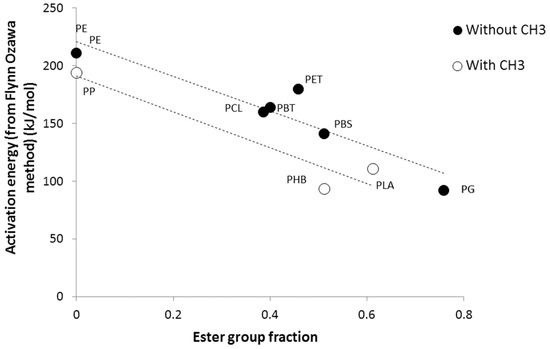 Figure 4 illustrates how the ester group fraction or the presence of a CH3 pendant group on the polymer backbone influences the activation energy value. The activation energy calculated from the Flynn-Wall-Ozawa method decreases when increasing the fraction of the ester group. For CH3-free polymers, the activation energy decreases linearly from 211 kJ/mol for PE (ester fraction 0) to 92 kJ/mol for polyglycolide (ester fraction 0.76). A similar decrease is observed for polymers containing a CH3 group, but whose activation energy is systematically lower for a given ester fraction. For example, the activation energy is 194 kJ/mol for PP (versus 211 kJ/mol for PE) and 91 kJ/mol for PHB (versus 141 kJ/mol for PBS). For these last two polymers, the ester fraction is 0.51.