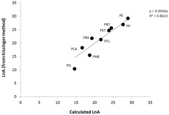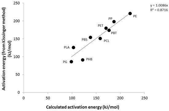 Figure 6 and Figure 7 show the correlation between the experimental values (i.e., obtained from the Kissinger method) and the calculated values, using values in Table 3. The correlation is quite good between the activation energy and the frequency factor. Note that the discrepancy between the experimental data and the calculated frequency factor concerns mainly the PHB, but also the PG (for the frequency factor). The contributions to activation energy and frequency factor are logically correlated (see Figure S3 in Supplementary Materials).