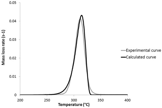 Figure 8 and Figure 9 show the experimental and calculated mass loss rate curves for PLA and PHB, respectively. Experimental curves have been obtained from HRR curves in a PCFC, using Equation (2). The curves for other studied polymers can be found in the Supplementary Materials. It is noticeable that the reaction models fit the mass loss rate curves quite well, at least when the mass loss rate is moderate to high (>0.005–0.01 s−1). The temperature and the intensity of the peak of mass loss rate are both well-fitted. The accuracy of the experimental curve is lower at low and high conversions, in particular for PHB. The calculated MLR curve for PCL is less satisfying, but the temperature and the intensity of the peak of the MLR remain well-fitted.