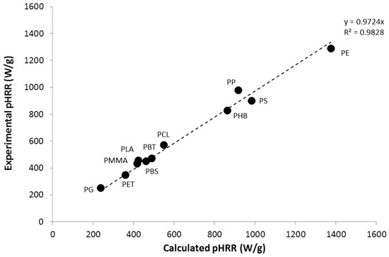 Using Equation (2), and the value of the heat of complete combustion listed in Table 1, it is easy to rebuild the HRR curves, and to compare the calculated and experimental pHRR. Figure 10 shows the good agreement between the pHRRs calculated using the kinetic triplets determined previously and the experimental pHRR.