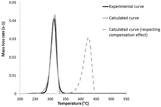 Nevertheless, due to the compensation effect, the frequency factor decreases together with activation energy. Therefore, the influence of activation energy on thermal stability is real, but limited. However, for PHB, the frequency factor is higher than expected, promoting a faster decomposition. Figure 11 shows the MLR curve of PHB if the compensation effect was respected, i.e., if the frequency factor was correlated with the activation energy through the relationship in Figure 5. In that case, the peak of MLR would be lower and shifted to higher temperature. The reason PHB does not respect the compensating effect is unknown.