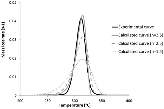 Finally, PG, PLA, and PHB also exhibit a high value for parameter n (2–2.5 and even 3.5 for PHB versus 1.5 for all other polyesters). A high value for n is also responsible for an increase of the pyrolysis rate. Figure 12 shows the calculated mass loss rate curves of PHB for different values of n. An increase in the n value does not influence the temperature of the peak, but increases significantly its intensity (i.e., also the intensity of pHRR).