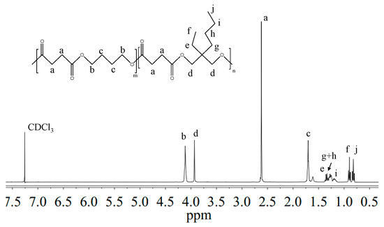 1H-NMR and 13C-NMR analysis have been carried out to: (i) verify the chemical structure; (ii) calculate the actual composition; and (iii) calculate the degree of randomness (b). As an example, Figure 2 reports the 1H-NMR spectrum of P(BS70BEPS30) with the corresponding resonance assignments.