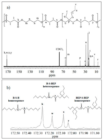 The chemical structure of the copolymer is confirmed, since no additional peaks were found in the spectrum. The copolymer composition was determined from the relative areas of the resonance peak of the b protons of the butylene sub-unit, located at 4.11 ppm and of the signal at 3.90 ppm corresponding to the d protons of the butyl-ethyl propylene moiety (see Figure 2). For all the copolymers, the actual composition is close to the feed one (see Table 1), proving a good control in the polymerization process. The degree of randomness (b) has been calculated by 13C-NMR spectroscopy. Figure 3 reports the 13C-NMR spectrum of P(BS70BEPS30) with the peaks assignments (Figure 3a) and the magnification of the region in between 172.50 and 171.80 ppm, where the signals due to the ester groups carbons are located (Figure 3b). In this region, together with the signals of the ester carbons at 172.26 and 172.03 ppm, corresponding to the B-S-B (k carbon) and BEP-S-BEP (y carbon) homosequences, respectively, two additional peaks in between can be detected. These signals are due to the B-S-BEP and BEP-S-B (w and x carbons) heterosequences, due to transesterification reactions. The degree of randomness b has been calculated from the intensity of the k, y, w and x peaks.