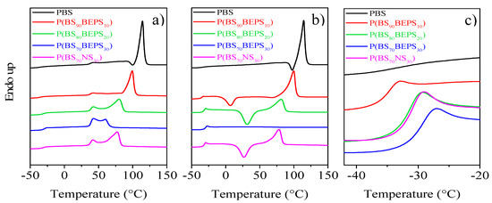 To analyze the effect of the presence of the BEPS and NS co-units on the Tg of PBS homopolymer, in Figure 4c, we have reported the temperature region at which the glass to rubber transition occurs.