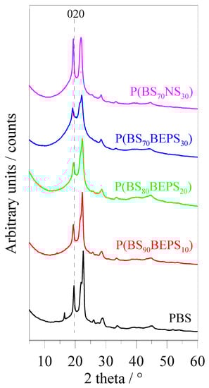 XRD profiles for the polymers under study. For PBS, the 0 2 0 reflection is indicated.