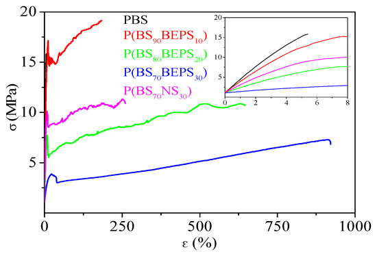Stress–strain curves of PBS, P(BSmBEPSn) and P(BS70NS30) random copolymers; in the inset: magnification of the low σ vs. ε region.