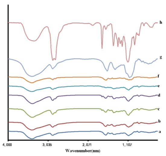 FT-IR spectra of different hydrogels and their components. (a) PVA-HLC; (b) PVA-HLC-T80; (c) PVA-HLC-CS; (d) PVA-HLC-CS-T80; (e) PVA; (f) HLC; (g) CS; (h) Tween80. PVA: Poly(vinyl alcohol). HLC: Human-like collagen. CS: Chitosan T80: Tween80.