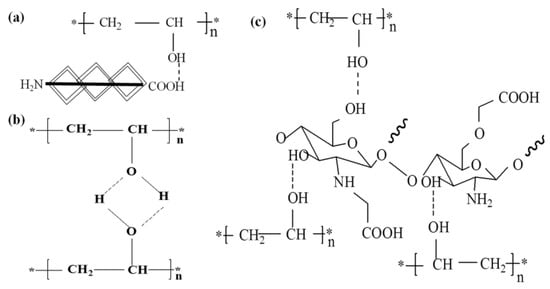 Crosslinking mechanism of the hydrogels. (a) Hydrogen bonds between PVA and HLC; (b) Intermolecular hydrogen bonds of PVA; (c) Hydrogen bonds between PVA and CS. PVA: Poly(vinyl alcohol). HLC: Human-like collagen. CS: Chitosan.