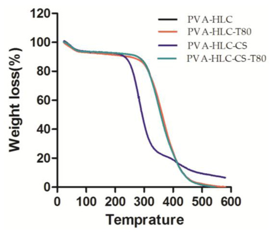 Thermogravimetric analysis TGA involves the measurement of changes in the weights of the samples instrumentally, over a specific range of temperature. The effects of molecular weight and the number of different components added to the thermal stabilities of dry hydrogels were evaluated in the temperature range of 20–600 °C. Results of the thermogravimetric analyses of the synthesized hydrogels are presented in Figure 4. It shows two main decomposition steps for the hydrogels. The initial decomposition temperature was from 20 °C to 100 °C, the corresponding weight losses of PVA-HLC, PVA-HLC-T80, PVA-HLC-CS and PVA-HLC-CS-T80 were 6.43%, 7.01%, 6.25% and 6.38% respectively. The weight loss at this stage was mainly due to the loss of bound water in the hydrogel. The second decomposition temperature range for the hydrogel PVA-HLC, PVA-HLC-T80 and PVA-HLC-CS-T80 was from 250 °C to 430 °C, 200 °C to 330 °C for PVA-HLC-CS. Weight loss at this stage was caused by the thermal decomposition of different components. When the temperature reached 500 °C, the residual weights of PVA-HLC, PVA-HLC-T80, PVA-HLC-CS and PVA-HLC-CS-T80 were 1.56, 2.32, 9.45 and 1.47 respectively, these are the weight value of carbon and ash after decomposition. The difference in degradation temperature was most likely due to the different amounts of PVA and HLC, as well as the pores in different hydrogels, which all contributed to the thermal stability of hydrogels [28].