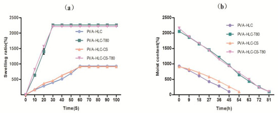 From Figure 5, we can see that hydrogels PVA-HLC-T80 and PVA-HLC-CS-T80 achieved swelling equilibrium within 30 s, and the water uptake capacity was found to be 2263.8% and 2216.1% at equilibrium, while PVA-HLC and PVA-HLC-CS took one min to achieve swelling equilibrium, and their water uptake capacity was smaller than 1000%. As for water retention time, PVA-HLC-T80 and PVA-HLC-CS-T80 took 81 h to return to dry state while PVA-HLC and PVA-HLC-CS needed 45 h and 54 h, respectively. The results revealed that hydrogel PVA-HLC-T80 and PVA-HLC-CS-T80 could quickly absorb a large amount of wound exudate, and hold water in the hydrogels for a relatively long time, thus providing a wet recovery environment for the wound, which meaning that they can be used as dressings for wounds which have a large amount of exudate.