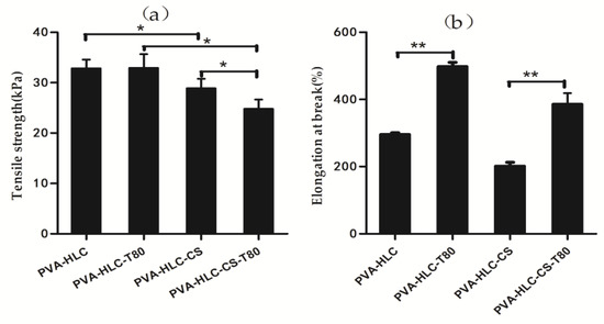 The tensile property of a dressing material is an important factor that affects their practical use in the protection of a wounded area. In this study, the tensile strength and value of elongation-at break of the prepared dressings were obtained, and the corresponding data are displayed in Figure 6. From Figure 6a, we can see that the tensile strength of the four hydrogels showed a gradual decline trend. The tensile strength of PVA-HLC was 32.84 kPa, which was the largest one, followed by PVA-HLC-T80 (31.45 kPa) and PVA-HLC-CS (27.63 kPa), and the smallest value appeared in hydrogel PVA-HLC-CS-T80, which was only 25.55 kPa. All the hydrogels showed the regular behavior of a flexible elastomer. With the addition of Tween80, the modulus values of the hydrogels decreased slightly. Meanwhile, the addition of Tween80 almost doubled the value of the elongational break. Furthermore, the hydrogels thus formed did not show any sign of deformation upon stretching.