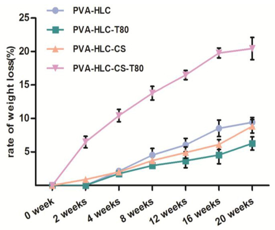 The difference in the degradation of the four hydrogels in vivo may be due to the presence of certain enzymes such as collagenase and the free radicals produced by the inflammation reaction, which are involved in the process of degradation. The main component of these hydrogels is PVA, which is difficult to hydrolyze, or become enzymatic in vivo. Compared with hydrogel PVA-HLC and PVA-HLC-T80, which were formed of PVA, HLC, hydrogel PVA-HLC-CS and PVA-HLC-CS-T80 were made of PVA, HLC, and CMCS, where HLC can be degraded by collagenase and CS can be hydrolyzed by body liquids.
