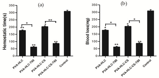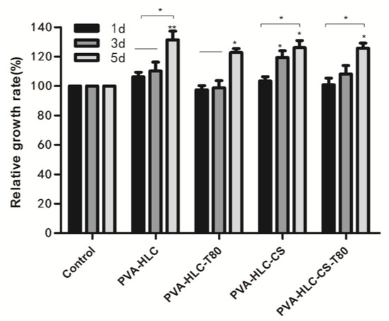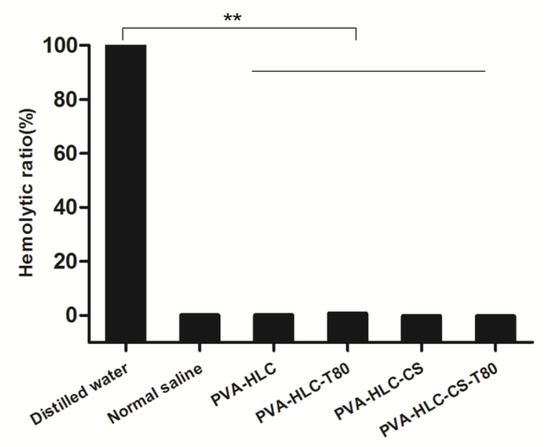 Porosity is an important aspect of scaffold and biomaterials engineering [29]. The high porosity of the dressings could benefit by absorbing exudate from the wound surface [30]. Furthermore, the presence of a large volume of porosity is also beneficial for the transfer of nutrients and oxygen to the cells attached to the dressings. From Table 1, we can see that the porosity of hydrogel PVA-HLC-T80 and PVA-HLC-CS-T80 ranged between 80~90%, far higher than that of the PVA-HLC and PVA-HLC-CS (39.88% and 38.20% respectively). Thus, the high porosity of PVA-HLC-T80 and PVA-HLC-CS-T80 has great benefit on the transmission of oxygen and nutrients for the wound area of the skin, which then promotes the wound healing process.