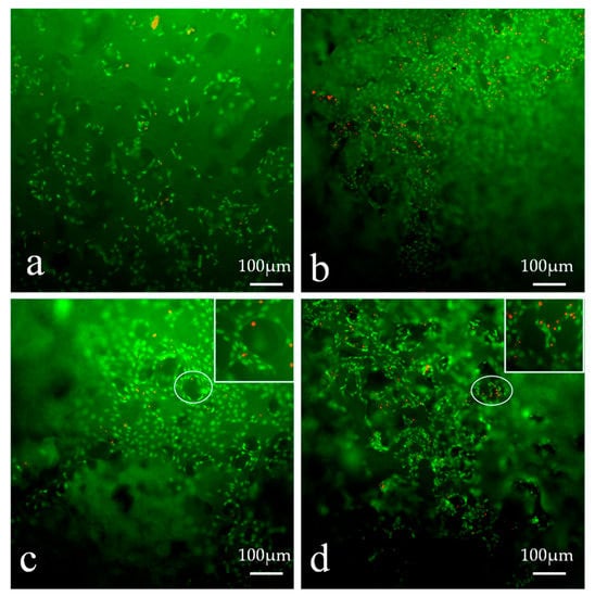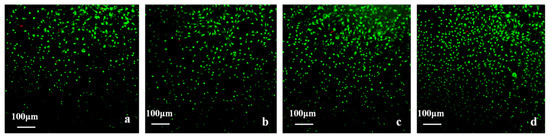 The hydrogels, together with the cells grown on them, were stained with an AO/EB staining kit and observed using inverted fluorescence microscopy. The stained images of the fibroblast cells seeded in scaffolds on the seventh day are shown in Figure 13. The fibroblast cells grew and covered the surface of the hydrogels and grew into the pore structure in the surface. Cells presented a strong green fluorescence signal, indicating good viability with any of the hydrogel samples. The images demonstrated that L929 cell adhesion was higher on PVA-HLC-T80 (Figure 13b) and PVA-HLC-CS-T80 (Figure 13d). Indeed, surface hydrophilicity, hydration and swelling as well as surface roughness are considered as important for cell attachment [35], which is why more cells adhered, grew and proliferated on the hydrogels PVA-HLC-T80 and PVA-HLC-CS-T80.