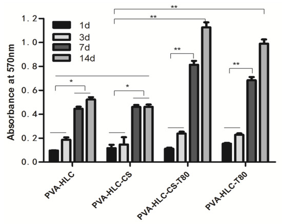 As shown in Figure 12, the number of cells attached to all scaffolds increased during the entire culture period. On day 1, there was no significant difference in the cell number among the four hydrogels except for PVA-HLC-CS-T80, which was 1.5 times higher than the others. However, after three days, the density of cells in PVA-HLC-T80 and PVA-HLC-CS-T80 was higher (p < 0.05) than that in PVA-HLC and PVA-HLC-CS. Even after seven days and 15 days, the number of cells in the two hydrogels with Tween80 were significantly higher (p < 0.05) than the others. This may have been due to the hydrogels PVA-HLC-T80 and PVA-HLC-CS-T80 having a suitable cell growth pore size, where cells can grow and proliferate freely, while cells can only grow on the limited surface of the other two hydrogels thus hindering their growth and proliferation.