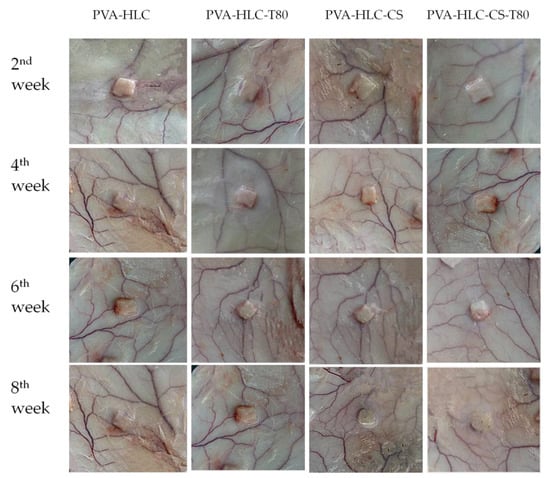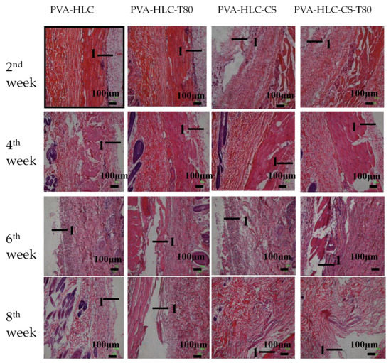 After implantation, the hydrogels formed regularly shaped skin protrusions and showed no significant degradation after eight weeks. Around the implantation site, we observed no abnormalities had developed in the tissue (Figure 14). The slight streak of blood observed at the second week indicated that the hydrogels were subjected to phagocytosis by inflammatory cells. However, there were no obvious symptoms after four weeks, indicating that the hydrogels gradually adapted to the tissue surrounding the implantation site. Moreover, no vascular proliferation or redness appeared at the implantation site, which implies the better histocompatibility of the hydrogels. After eight weeks, the PVA-HLC and PVA-HLC-T80 hydrogels maintained their integrity, while PVA-HLC-CS and PVA-HLC-CS-T80 showed a slight degradation as the corners disappeared and the hydrogels changed into a cylindrical shape. Furthermore, the inflammation almost disappeared.