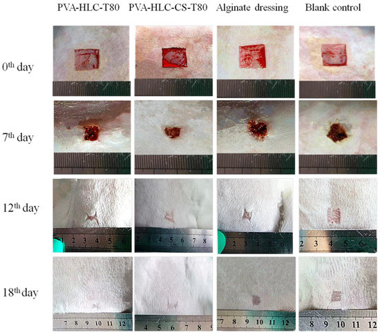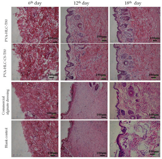 Wound healing is a complex process that can be affected by many factors [36]. Thus, dressings with various properties that can enhance wound healing process are highly desirable. Considering the wound recovery rate, when compared with two control groups, PVA-HLC-T80 and PVA-HLC-CS-T80 groups had been in a leading position from the sixth day to the 18th day, perhaps due to the strong water absorbing capacity, large porosity, suitable water vapor permeability, excellent bacterial barrier activity and good hemostatic activity of these two hydrogels working together, which would contribute to accelerating the wound healing process.