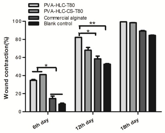 Contraction ratio of different hydrogel treated wounds after different periods of time. Where “*” and “**” represent the p-value < 0.05 and p-value < 0.01, respectively.