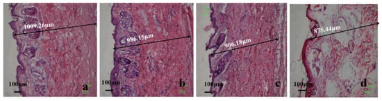 Granulation tissue in all groups showed differences between thickness and morphology (Figure 21). The granulation tissue in the PVA-HLC-T80 and PVA-HLC-CS-T80 hydrogel groups were 1009.26 μm and 986.15 μm, respectively, which was at least 80 μm thicker than that of the two control groups. Granulation tissue consists of accumulated extracellular matrix, fibroblasts, and other cells [39]. The wound healing process would benefit from the formation of a better granulation tissue with more accumulated extracellular matrixes, fibroblasts [40]. The in vivo study indicated that the hydrogel PVA-HLC-T80 and PVA-HLC-CS-T80 dressings improved wound healing through promoting the formation of granulation tissue.