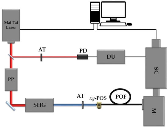 Figure 1 sketches the experimental set-up employed to carry out our measurements. It includes a tunable ultrafast femtosecond laser (Spectra Physics Mai-Tai HP, Newport, Santa Clara, CA, USA) with a repetition rate of 80 MHz and a spectral emission range between 690 and 1040 nm. The selection of the desired emission wavelength is easily carried out by means of the specific software provided by the manufacturer. The laser emits pulsed beams of around 100 fs, 1.2 mm in diameter, and with a Gaussian-spatial distribution. The spectral width of the pulses is around 15 nm. For our measurements, the repetition rate of this laser was reduced to 8 MHz by using a pulse picker (Spectra Physics 3986, Newport, Santa Clara, CA, USA), which is based on an acoustic-optic modulator. In order to obtain excitation in the visible range from 400 to 520 nm, a second-harmonic generator (Inspire Blue, Radiantis, Barcelona, Spain) was employed. The impinging power is controlled by manually adjusting the variable attenuator placed before the POF sample. For all the wavelengths considered, the fibers were excited with an average light power of 9 nW, which is well below the limit that would produce damage in the fiber and nonlinear effects. The measured fiber samples were held by an xy-micropositioner in order to focus the incident laser beam just on the fiber-end face. The transmitted pulses were acquired by means of a combination of a monochromator (Acton SP2300, Princeton instruments, Trenton, NJ, USA) and an ultrafast Streak Camera (C10627, Hamamatsu, Hamamatsu City, Japan). This combination of both devices gives the option to resolve the acquired signals both spectrally and temporally, which means that the whole spectrum is obtained at the same instant of time. The maximum possible acquisition-wavelength range extends from 0 to 1400 nm. In order to properly synchronize both the excitation and the acquisition systems, a small amount of the laser signal is diverted from the laser output and directed to a photodetector, whose electric signal is delayed by means of a delay unit. A precise use of this delay unit guarantees the visualization of the transmitted pulses on the corresponding temporal window of the Streak Camera. The acquisition system is controlled by a 2.66 GHz Intel personal computer (PC) with 2 GB of random access memory (RAM). Both parts of the acquisition system and the measurements are controlled by the Hamamatsu HPDTA software (High-Performance Digital Temporal Analyzer, Hamamatsu, Hamamatsu City, Japan), which allows real-time data acquisition. Once the acquisition was performed, the data analysis was carried out by employing an ad-hoc Matlab program developed for this purpose.