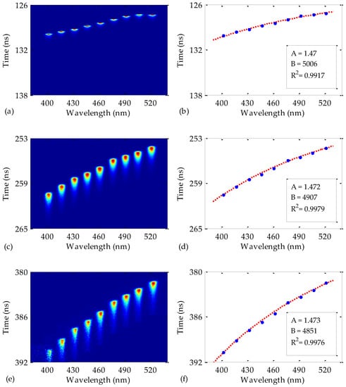 The instants of maximum pulse intensity in Figure 3a,c,e are shown in the corresponding figures on the right-hand side. The least-squares fittings of these points to Equation (3) give us the expressions for the spectral time delays for each fiber length. The resulting constants for Equation (3) and the corresponding coefficients of determination of the fittings (R2) are summarized in Table 2. These constants are employed in Equation (4) to achieve the material dispersion coefficients D(λ) of the fibers. The results are shown in Figure 4a. It can be noticed that the value of D(λ) slightly depends on the fiber length. Specifically, the maximum relative discrepancy from one fiber length to another is around 3% at the wavelength interval considered in the figure. This means that the employed fiber length does not alter the results significantly when characterizing the dispersion of POFs.
