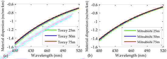 We also analyzed three PMMA fiber samples manufactured by a second manufacturer, i.e., Mitsubishi (see Table 1 for further details). The lengths of these fibers were, again, 25, 50, and 75 m. In this respect, the process was carried out under the same conditions and exactly in the same way as described above, and the obtained results for the material dispersion are shown in Figure 4b and Table 2. The new measurements using a different brand confirm again that the dispersion coefficients are independent of the fiber length. Moreover, for each fiber length, the results obtained with both brands of fiber (Toray and Mitsubishi) are almost identical, the maximum difference detected being 3%.