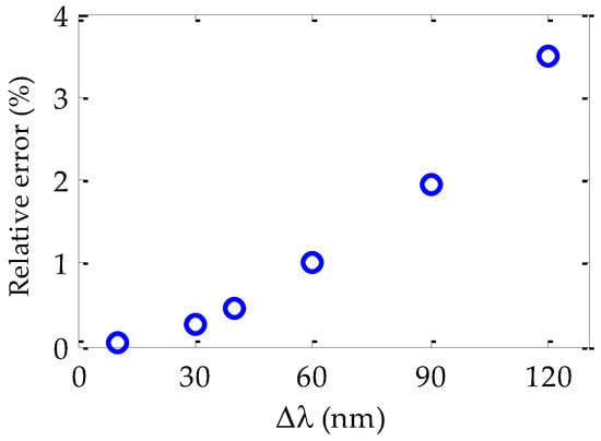It should be noted that the dispersion results were obtained by using Equation (4), which is only valid when the considered wavelength interval Δλ is small, as was explained in Section 2. The lack of accuracy when Δλ is too large can be observed in Figure 5, in which the results obtained by using Equation (4) for the 50 m Toray fiber are compared with the dispersion values corresponding to larger intervals of Δλ (from 10 to 120 nm). The discrepancies are plotted as relative errors. In such intervals, the derivative (dtg/dλ) that is necessary to calculate D(λ) was estimated by using the two edges of the wavelength interval considered. As can be observed, the relative error is lower than 1% only when the wavelength interval is smaller than 40 nm. In other words, for any light source centered at any wavelength, the dispersion given by Equation (4) is accurate as long as the spectral width is not broader than 40 nm, taking the criterion of the 1%.