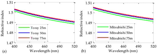 Refractive indices obtained for POFs made by Toray (a) and by Mitsubishi (b). Three different lengths of fiber have been employed for each manufacturer: 25 m (green lines), 50 m (blue lines), and 75 m (red lines).