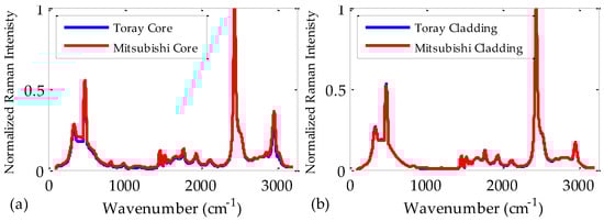 Normalized Raman spectrum measured for the cores (a) and for the claddings (b) of two different brands of fiber: Toray (blue lines) and Mitsubishi (red lines). With both manufacturers, the core is made of PMMA and the cladding is made of a fluorinated polymer.