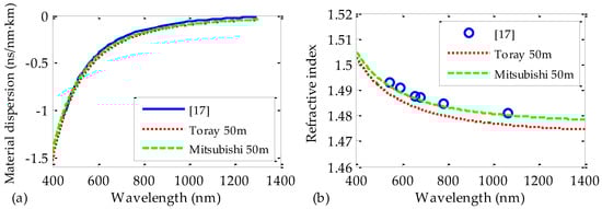 Finally, we compared the values obtained in this work for the refractive indices and for the coefficients of chromatic dispersion with those reported by other authors from measurements of PMMA fiber preforms [] (see Figure 8). For this purpose, 50 m samples of both manufacturers were analyzed in an extended range of wavelengths, up to the near infrared region, where some of the data are available. It is clear that the results obtained in this work match satisfactorily with those reported from PMMA fiber preforms. Moreover, our calculated refractive indices also coincide with the values obtained from PMMA bulk material that can be found in the literature [,]. These similarities between our results and those reported from other measurement methods seem to corroborate the validity of our measurement technique and of our results. We would also like to emphasize that our measurement technique allows us to directly obtain the refractive indices and the coefficients of dispersion from the POF, without having to use the preform or the bulk material, which is the main novelty of our work.