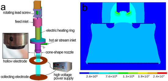 Schematic diagram (a) and electric simulation (b) of melt differential electrospinning device.