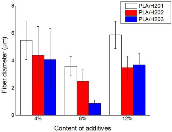 The component of HBPs plays a significant role in controlling the diameter of the final fiber. The addition of 8% H203, the prepared fibers have an optimized diameter of 896 nm, which is much smaller than that of the neat PLA fibers. This result may be ascribed to the fact that only part of PLA molecular chains are untangled when the content of HBPs is relatively low (4%), while the disentanglements of PLA polymer chains increased with HBPs concentration and nearly all chains were untangled when the HBP content reached 8%. However, the average fiber diameter increased when continuously increasing the HBPs to 12%. This may be due to the fact that a majority of chain entanglements have already been removed with the presence of 8% HBPs, and further increasing the additive content would not help in reducing fiber diameter. In addition, HBPs with a similar structure but different molecular weight and hydroxyl group number also have an evident impact on the diameter and distribution of PLA fiber. The averaged fiber diameter decreases when increasing the molecular weight of the added HBPs. This result is understandable, because HBPs with larger molecular weights can separate the PLA chains from each other with a larger distance, which results in a lower viscosity.