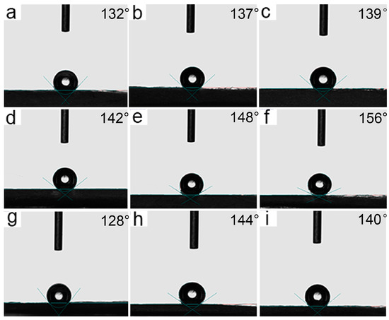 Contact angle images of melt electrospun fibers ((a–i) (4% H201)/PLA, (4% H202)/PLA, (4% H203)/PLA, (8% H201)/PLA, (8% H202)/PLA, (8% H203)/PLA, (12% H201)/PLA, (12% H202)/PLA, and (12% H203)/PLA.