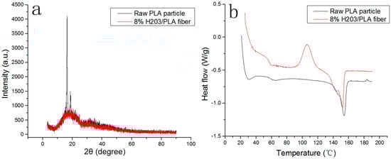 XRD scan (a) and DSC curve (b) for raw PLA particle and (8% H203)/PLA fiber.