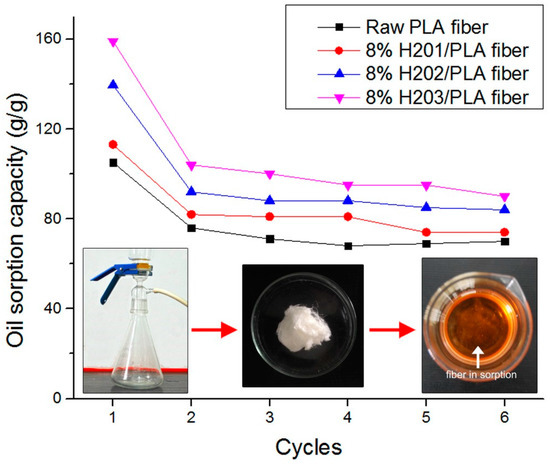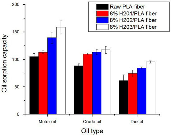 The above-mentioned interaction between water/oil and electrospun fibrous membrane demonstrates that oil could be selectively absorbed by the electrospun fibers when the fibrous sorbent is in contact with oil-water mixtures. The oil sorption tests were first conducted in a pure oil system without any water to qualitatively evaluate the maximum oil sorption capacity for the raw and HBPs modified PLA fibers, respectively. As shown in Figure 6, the oil sorption capacity of the raw PLA fiber for the motor oil, crude oil and diesel is 105, 89, and 62 g/g, respectively, which is four to five times higher than that of the conventional PP sorbent. With the decreasing of fiber diameter, there is an apparent increase in oil sorption capacity. The (8% H203)/PLA fiber exhibits the highest oil sorption capacities of 159, 118, and 96 g/g for motor oil, crude oil and diesel, respectively. These obtained data suggests that fiber diameter plays an essential role in determining the oil sorption capacity of fibrous sorbent. Thinner fiber assembly has a larger specific surface area and higher porosity, so it provides larger area and space for absorbed oil to be wrapped into. It can also be observed that the oil sorption capacity of the fiber samples for the tested oils is in the order of motor oil > crude oil > diesel, which is related to the viscosity and density of the tested oils. The oil sorption capacity of the same fiber increases with the viscosity of the oil, because oil with a higher viscosity more easily adheres onto the fiber surface and retains in the inter-fiber voids. In the case of oil with low viscosity and low specific gravity, the oil flows into the capillary network of fibrous mats as well as onto the fiber surface at a certain speed, but it also desorbs easily at the same time. This finding is consistent with a report in previous literature [29].