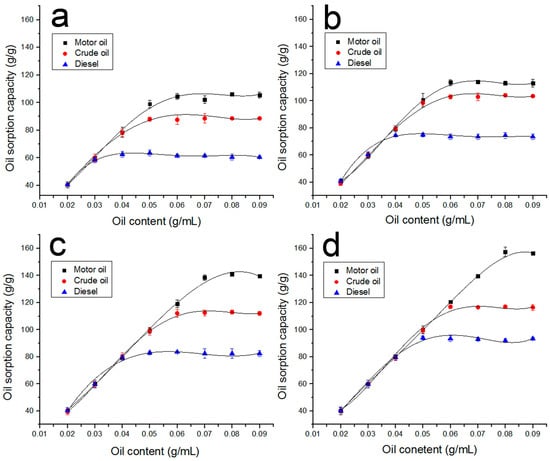 Effect of oil concentration on oil sorption capacity by raw PLA fiber (a); (8% H201)/PLA fiber (b); (8% H202)/PLA fiber (c); and (8% H203)/PLA fiber (d).