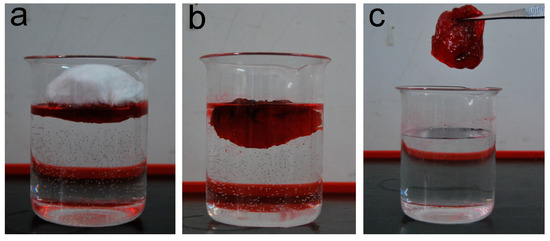 Optical images of recovery of motor oil (colored with oil red O) from water by raw PLA fiber. (a) Motor oil-water mixture; (b) oil being absorbed by fibrous sorbent; (c) complete separation of motor oil from water.