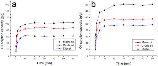 The oil sorption kinetics can describe the uptake rate and give the theoretical sorption capacity. To obtain the kinetic curve, the weight of the swollen sorbent was measured at different adsorption times (30 s, 1 min, 2 min, 5 min, 10 min, 20 min, 30 min, 40 min, 50 min, and 1 h) through the oil sorption process. As shown in Figure 10, the oil pickup rate for the tested oils is fastest and over 90% of the tested oils are absorbed in the first 5 min, and thereafter the pickup rate gradually slows down until the sorption-desorption process comes to an equilibrium state. The rapid sorption rate at the initial stage may be attributed to the huge area of available exterior surface and the strong affinity force between the fibrous sorbent and the oil molecules. Further on, the blockage of capillary tubes of fibrous sorbent gradually leads to the decrease of capillary numbers. Finally, a thermodynamic equilibrium is reached when the amount of oil desorbing form the fibrous sorbent is in dynamic equilibrium with the amount of oil being adsorbed onto the fibrous sorbent. The parameters of the oil sorption kinetics can be obtained by fitting the data of the oil sorption kinetic curve according to the Lagergren pseudo-first order and Lagergren pseudo-second order equations.