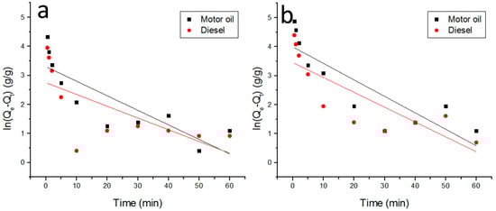 where Qt (g/g) is the sorption capacity of swelling sorbent at time t, Qe (g/g) is the oil sorption capacity at equilibrium, K1 (g/g·min−1) is the sorption rate constant. The integration of Equation (3) derives