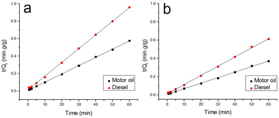The saturated sorption capacity Qe and the sorption rate constant K2 can be calculated based on fitting Equation (6). The sorption time T for equilibrium can be calculated also as the time for the sorption capacity to reach 95% of Qe. The linear fitting curves of second-order kinetic law of Lagergren model are shown in Figure 12. All the parameters of oil sorption kinetics are shown in Table 4. The determination coefficients R22 are well above 0.99, and there is a great agreement between experimental and theoretical oil sorption values, verifying that the second-order kinetic law of the Lagergren model can perfectly describe the sorption process of the prepared fibers for both oils.