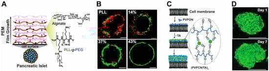 | Immune modulation | Protecting cells from immune responsesModulating complement activation with polymer grafting | [3,42][66] |