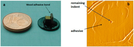 Nanoindentation sample of a few millimetres’ edge length, cut off from the glued beech veneers (a); Scanning probe microscopy image illustrating a nanoindent measurement point in an adhesive-filled cell lumen, scan size 15 µm × 15 µm (b).