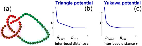 Langevin dynamics simulations are performed for ring chains using the LAMMPS program [37]. The circular chain is modeled by a bead-spring model [38] with an extra pairwise soft potential (Figure 1). The total pairwise interaction between monomers is a hardcore repulsion plus a soft potential, . The hardcore pairwise interaction between monomers is described by a purely repulsive Lennard–Jones potential